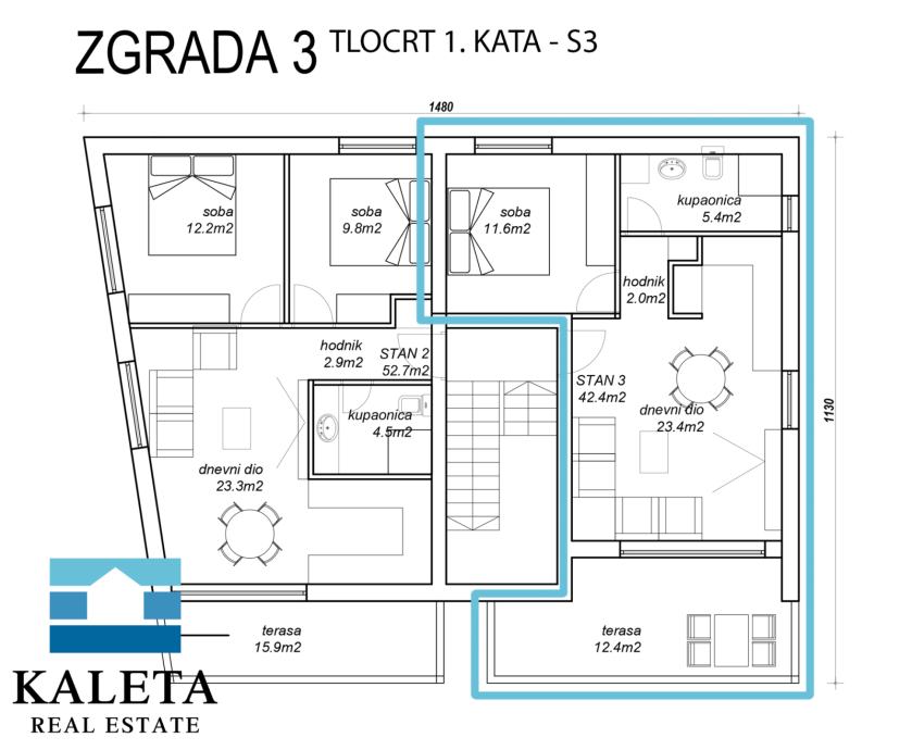Prostran stan površine 42,4 m² + terasa 12,4 m² + 2 parkirna mjesta nalazi se na 1. katu visokokvalitetne zgrade s ukupno 4 stana. Ukupna prodajna kvadratura s pripadcima i koeficijentima iznosi cca 53,6 m² po cijeni od 3.400 €/m².