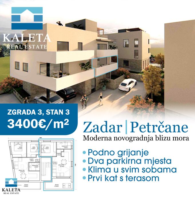 Na prodaju su stanovi u novom naselju u Petrčanima kraj Zadra, svega 650 m od mora zračne linije. Radi se o 5 zgrada, svakoj s 4 stana, a svakom stanu pripadaju 2 parkirna mjesta.