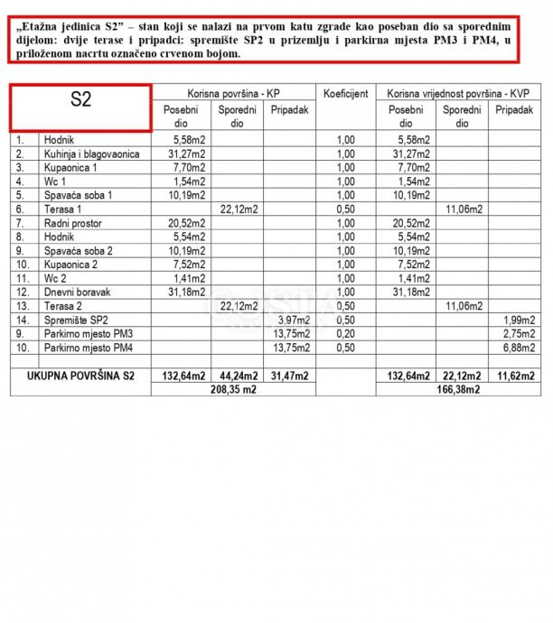 Prodaje se prostrani stan u izgradnji u mjestu Petrčane u okolici Zadra. Stan stambene površine 132,64 m2 nalazi se na prvom katu manje stambene zgrade od 4 jedinice. Sastoji se od prostranog dnevnog boravka, kuhinje i blagovaone, tri spavaće sobe, dvije kupaonice i dva dodatna wc, te dvije terase od dodatnih 44 m2. Stanu pripada i spremište te dva privatna parkirna mjesta. Sveukupna korisna površina stana zajedno sa svim pripacima iznosi 208,35 m2 (K.V. 166,38 m2).