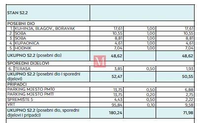 Ukupna površina stana je 180,24 m2, a netto korisna površina stana i njegovih pripadaka je 71,98 m2.