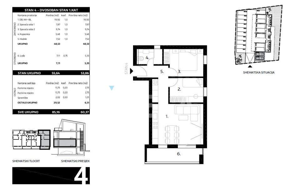 Stan se sastoji od ulaznog hodnika, kupaone, 2 spavaće sobe, boravka s kuhinjom i blagavaonom (open space), lođe te spremišta.