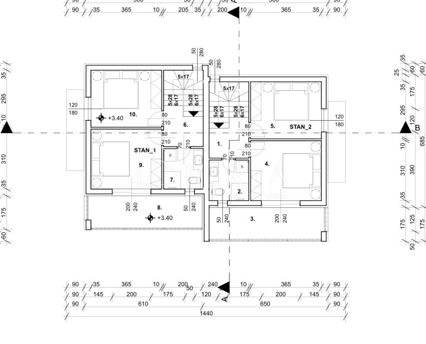 Svaka kuća se sastoji od prizemlja i kata koje su vertikalno povezane unutarnjim stepeništem.