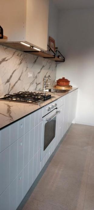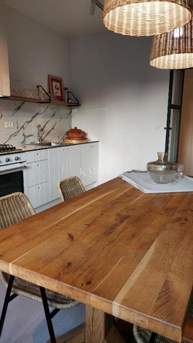 Dnevni boravak i kuhinja čine jednu veliku, ugodnu cjelinu, idealnu za svakodnevni život, druženja i obiteljske trenutke. U središtu se nalazi ručno rađen blagovaonski stol, djelo poznatog zadarskog stolara, kao i ostatak namještaja u stanu – sav namještaj u stanu izrađen je po mjeri, precizno i s puno pažnje, kako bi prostor ostao funkcionalan i nenametljiv, a opet u potpunosti opremljen.
