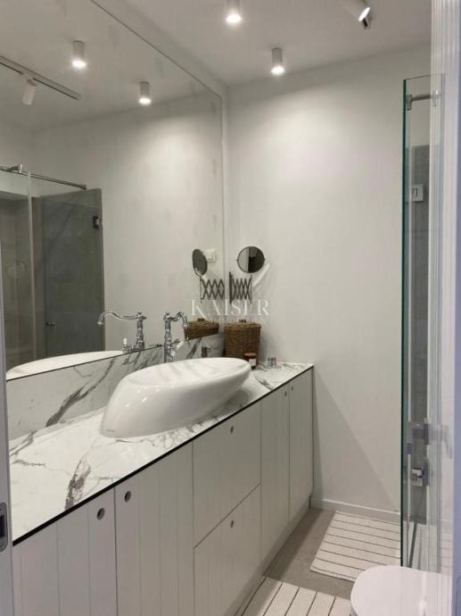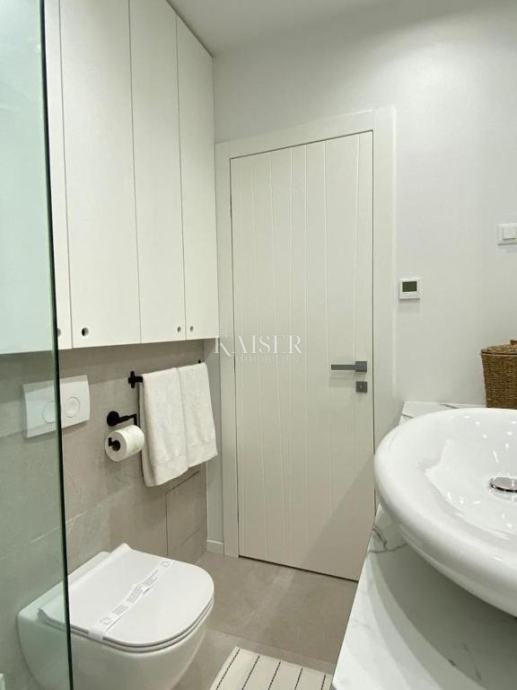 Kupaonica je prostrana, jednostavna i elegantna sa tuš kabinom i zidnim orarom te opremljena perilicom i sušilicom ugrađenima u kupaonski ormar.