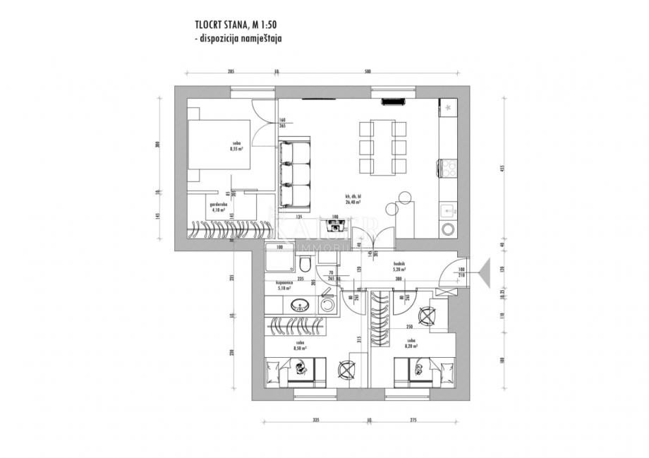 Raspored je iznimno funkcionalan – stan ima tri spavaće sobe, dvije manje dječje sobe te glavnu spavaću sobu s velikim walk-in ormarom. Ta je soba, kao i dnevni boravak, od ostatka stana elegantno odvojena staklenim vratima s kovanim željezom, dok su kuhinja i dnevni prostor povezani francuskim vratima istih materijala, što stanu daje osjećaj prostorne povezanosti, ali i jasno definiranih zona.