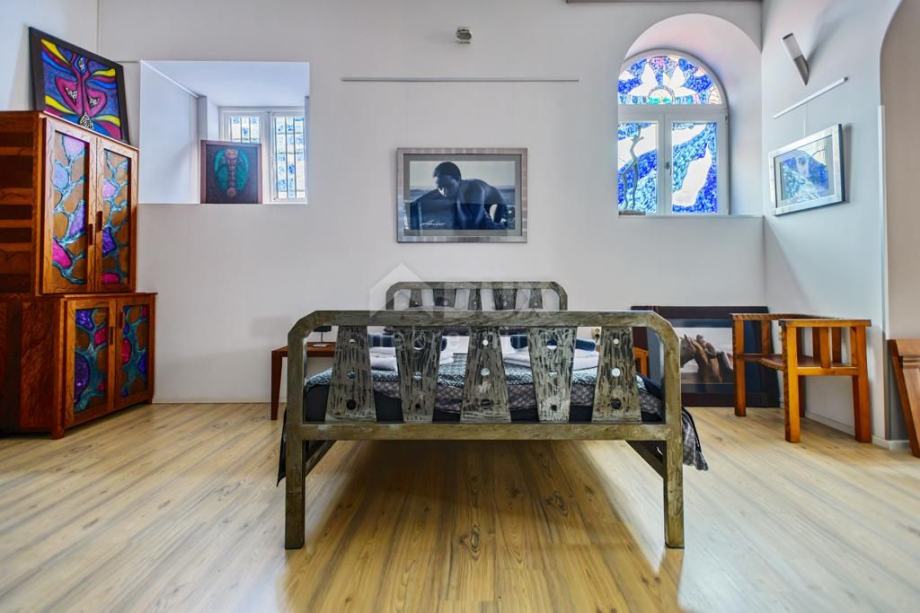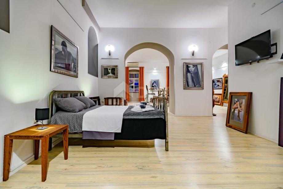 Prodaje se umjetnički stan na Poluotoku u Zadru. Stan ukupne stambene površine 86 m2 smješten je na drugom katu povijesne zgrade u samoj gradskoj jezgri. Koncept prostora osmišljen je kao open space koji nalikuje umjetničkoj galeriji. S glavnih vrata ulazimo kroz hodnik u prostranu prostoriju s visokim stropovima koja se sastoji od dva dijela. S desne strane kroz dva arkadna prolaza ulazimo u galerijski prostor s umjetninama i velikim stolom. S lijeve strane nalazi se ručno rađeni krevet, te ulaz u kuhinju. Mali hodnik vodi do još jedne spavaće sobe i kupaonice. Stan je klimatiziran, te je kompletno renoviran 2013. godine kada su promijenjene podne obloge i stolarija te je postavljen novi namještaj.
