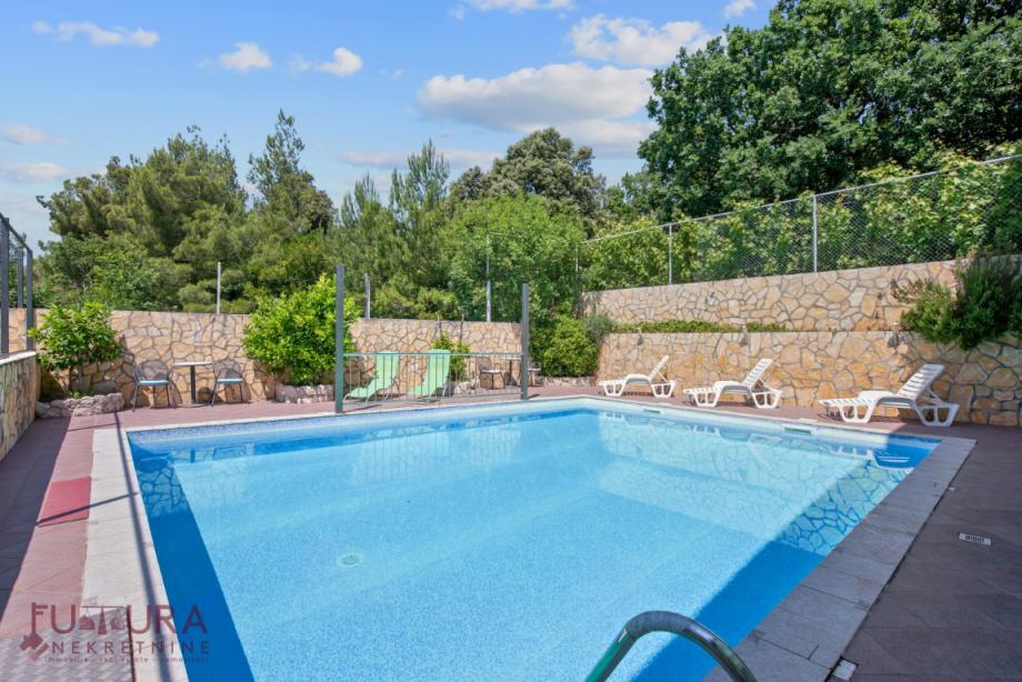 Posjeduje 14 parkirnih mjesta, bazen 8m x 8m, restoran za goste objekta, skladište, tri spremišta, kotlovnicu, vanjski komin sa terasom, igralište 10m x6m te zajedničku terasu na prvom katu.