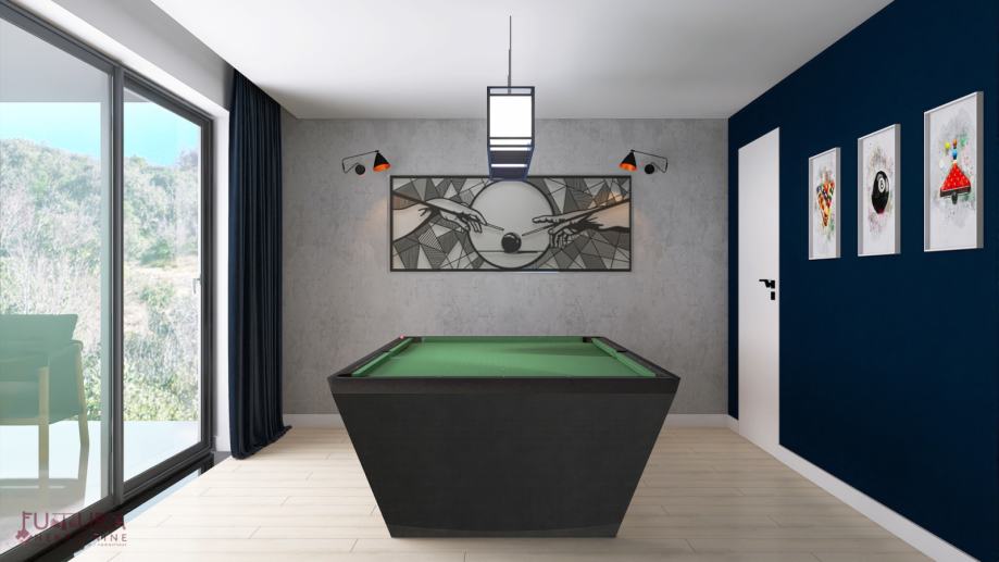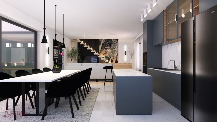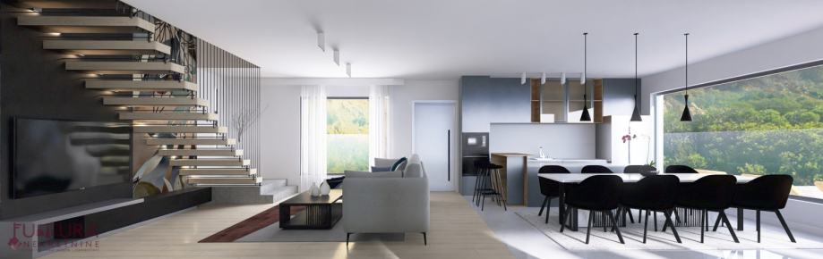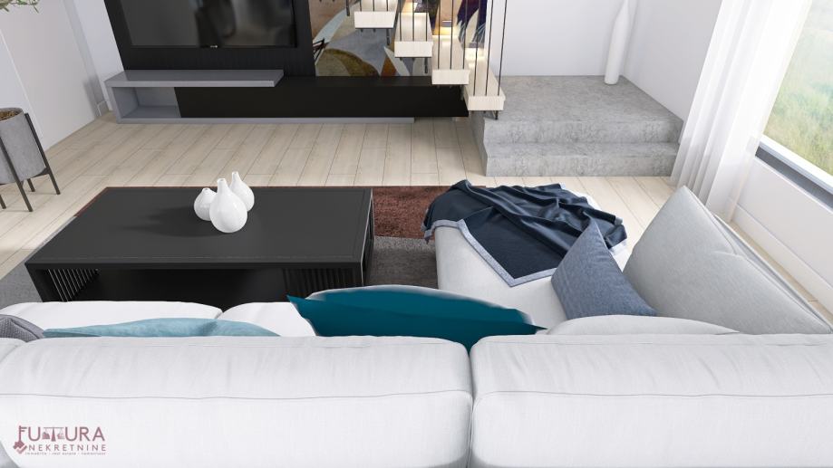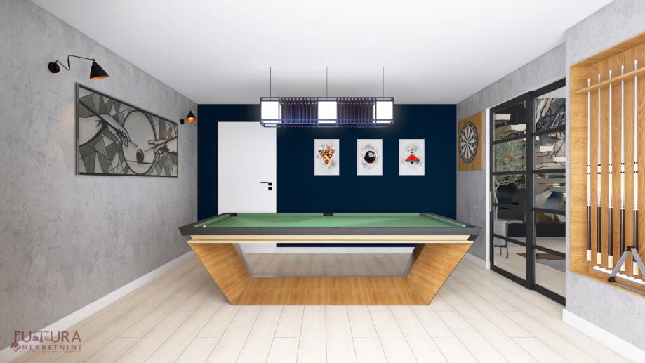 Prizemlje: dnevni boravak + kuhinja + blagovaona, hodnik, igraonica opremljena stolom za biljar, kupaonica, praona, ostava i natkrivena terasa.