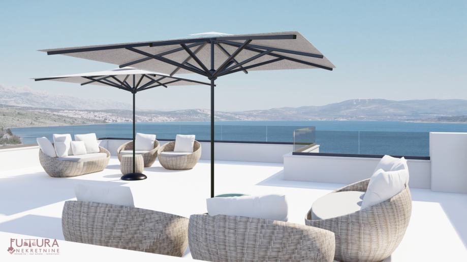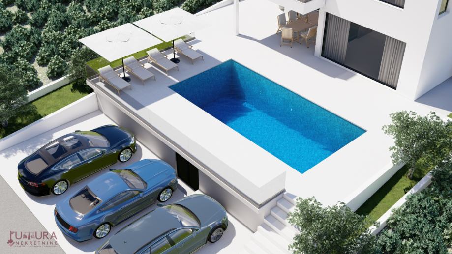 Posjeduje tri parkirna mjesta, bazen i krovnu terasu.
