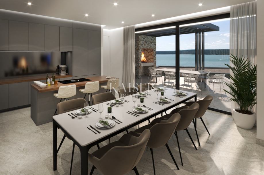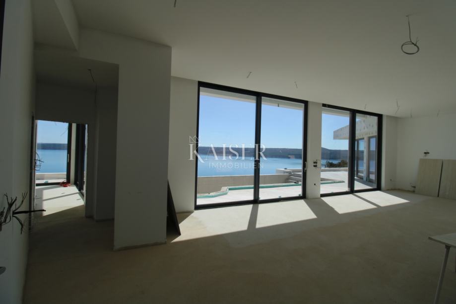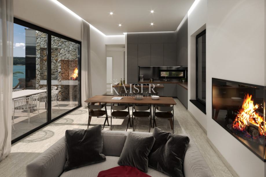 Korak unutar vile otkriva pažljivo osmišljen raspored, gdje svaki kutak odiše sofisticiranošću i udobnošću. Glavni ulaz u stambenu građevinu je sa sjeveroistočne strane, odakle se pristupa u ulazni hodnik. Nadalje nas uvodi u prostrani open-space koncept dnevnog boravka (29,20 m2) s kuhinjom i blagovaonicom (27,50 m2). Velike klizne staklene stijene u punoj visini objekta protežu se cijelom prednjom stranom vile, vizualno povezuju unutrašnjost s vanjskim prostorom, omogućujući spektakularan pogled na more iz cjelokupnog h prostora vile koji obuhvaća dnevni i spavaći prostor. Ovaj otvoreni koncept stvara fluidnost prostora, omogućuje nesmetani protok svjetlosti i otvara pogled prema eksterijeru.