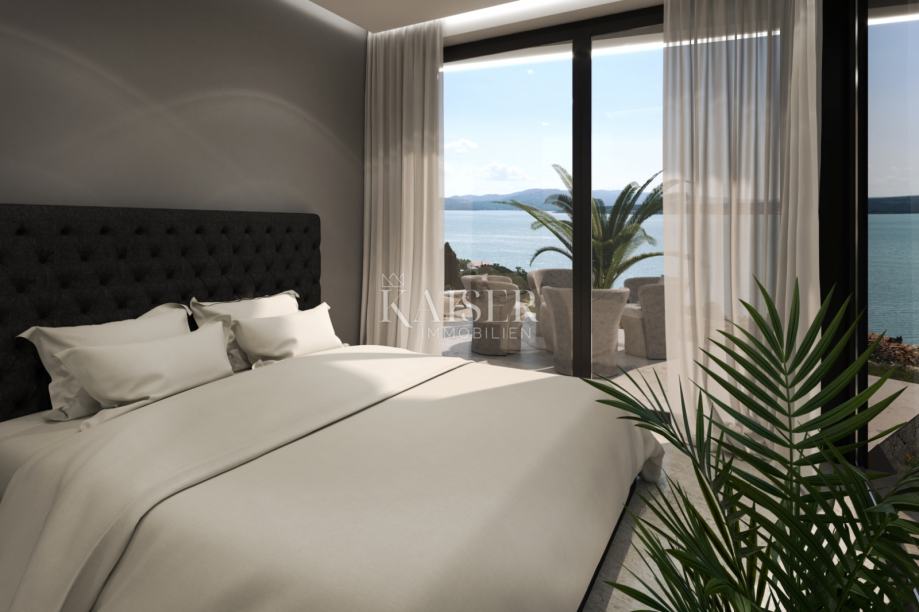 S obje strane vile smještene su po dvije privatne spavaće sobe, osmišljene tako da osiguraju maksimalan mir i privatnost. Na lijevoj strani vile nalaze se dvije elegantne sobe, 13,60 m2 i 14,10 m2, svaka sa svojom moderno opremljenom kupaonicom (4,20 m2 i 4,00 m2),na desnoj strani vile nalaze se također dvije spavaće sobe, od kojih jedna ima 13,60 m2, a glavna spavaća soba pruža 17,00 m2 vrhunske udobnosti, uz pripadajuću kupaonicu od 3,80 m2. Sve sobe imaju panoramski pogled na more i direktan izlaz na prostranu terasu (42,00 m2), koja se otvara prema bazenu i pruža očaravajući pogled na more i vrt sa stoljetnim maslinama.
