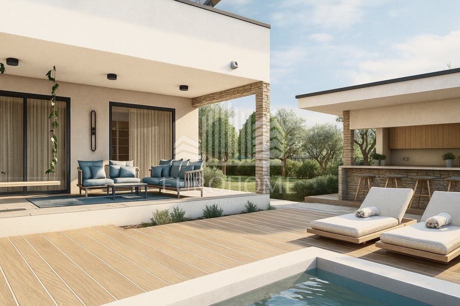 Zemljište nudi mogućnost uređenja bazena, vrta, terasa, ljetne kuhinje i zona za odmor. Kuća je projektirana s pet spavaćih soba, a interijer se može prilagoditi vlastitim potrebama.