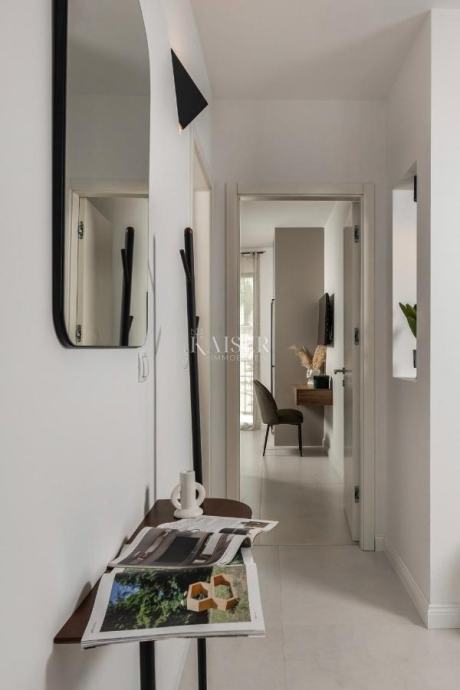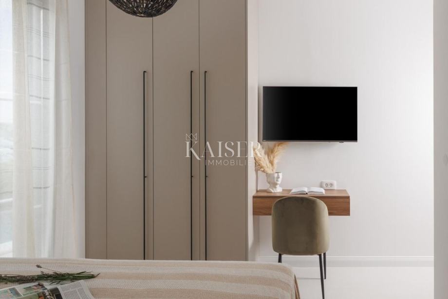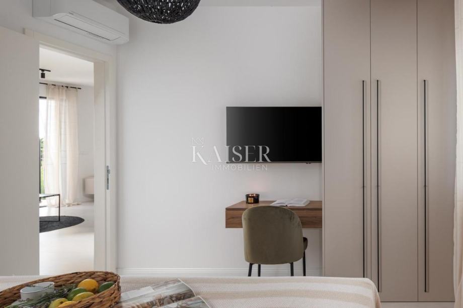 Kat vile izveden je montažnom gradnjom visoke kvalitete i u potpunosti je dovršen, moderno uređen i odmah spreman za korištenje. Na katu se nalazi prostrani dnevni boravak s kuhinjom i blagovaonicom otvorenog koncepta, odakle se kroz velike staklene stijene izlazi na veliku terasu s bazenom površine 15 m² i sunčalištem. Vila ima dvije prostrane spavaće sobe, svaka s vlastitom kupaonicom, dodatni gostinjski WC te funkcionalnu ostavu/praonicu rublja. Interijer je opremljen dizajnerskim namještajem i vrhunskim uređajima, a podno grijanje u cijelom stambenom dijelu osigurava udobnost i tijekom hladnijih mjeseci.
