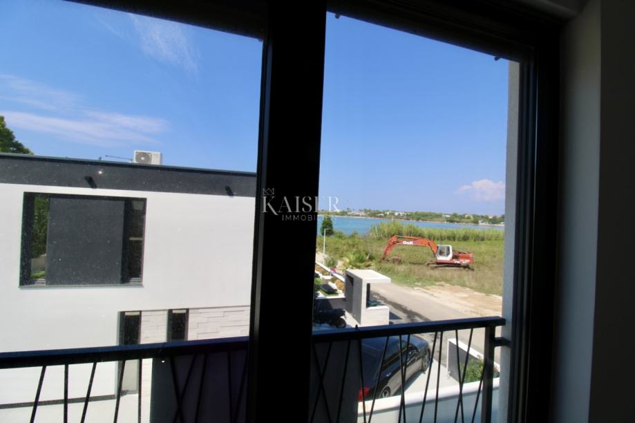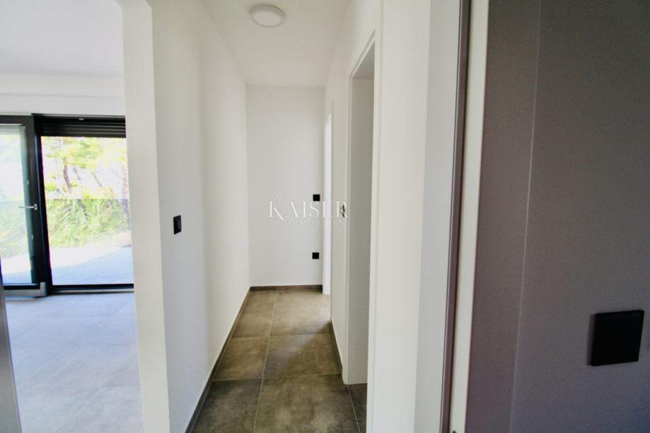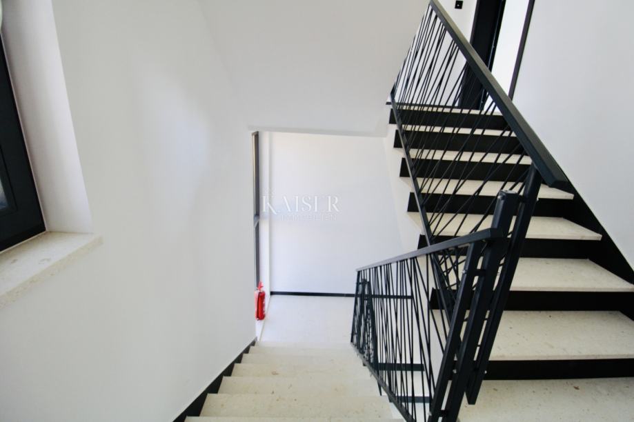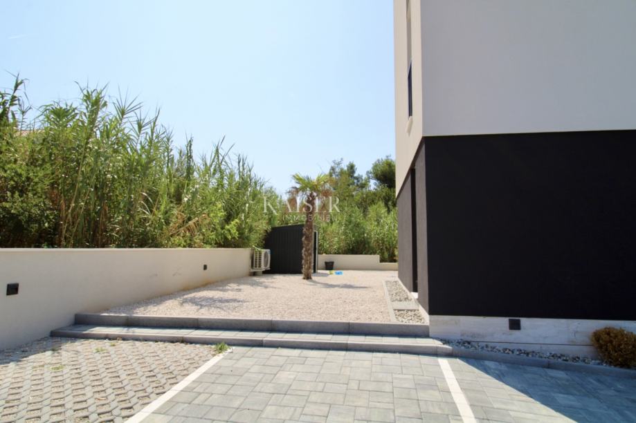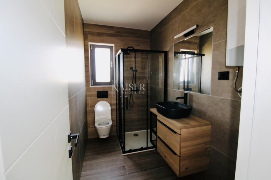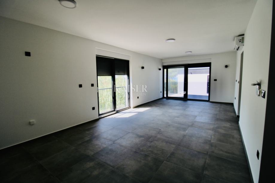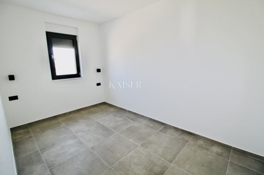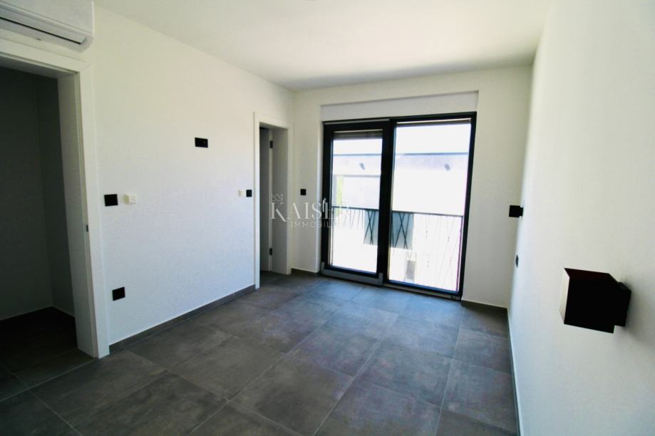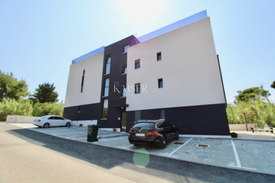 Kaiser Immobilien nudi prostran i moderan apartman u novogradnji, smješten na prvom katu zgrade koja se nalazi svega 70 metara od mora. Stan površine 73,30 m2 sastoji se od svijetlog i prozračnog open space dnevnog boravka, kuhinje i blagovaonice s izlazom na natkrivenu terasu, savršenu za uživanje u vanjskom prostoru s koje se pruža djelomičan pogled na more. U drugom dijelu stana nalaze se dvije spavaće sobe, od kojih jedna ima vlastitu kupaonicu, dok je druga kupaonica smještena u hodniku. Prodaje se nenamješten što omogućuje novim vlasnicima da ga urede po vlastitom ukusu i potrebama. Uz stan dolaze i dva parkirna mjesta P2 i P3, s ukupnom neto korisnom površinom od 78,30 m2.