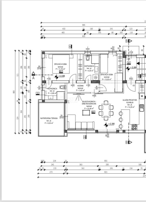 Podovi ovog stana su obloženi kombinacijom visokokvalitetnih keramičkih pločica i laminata. Keramičke pločice nalaze se u hodniku, kuhinji, kupaonicama i na terasi, dok su u dnevnom boravku i spavaćim sobama postavljeni laminatni podovi, što pruža toplinu i udobnost. Ova kombinacija materijala osigurava dugotrajnost, lakoću održavanja i moderan izgled stana. Prozori su izrađeni od PVC-a s troslojnim staklom, roletama i komarnicima, što pruža dodatnu izolaciju i zaštitu. Dnevni boravak i spavaće sobe su klimatizirani, a cijelim stanom provedeno je podno grijanje na struju, što osigurava udobnost tijekom hladnijih mjeseci. Ulazna vrata stana su protuprovalna i protupožarna, čime se jamči visoka razina sigurnosti.