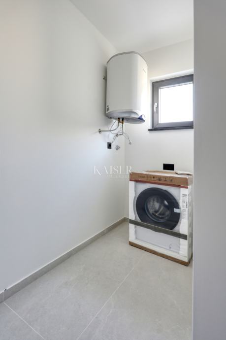 Podne obloge izvedene su u elegantnoj kombinaciji visokokvalitetnih keramičkih pločica i laminata: pločice su postavljene u hodniku, kupaonicama, kuhinji i na terasi, dok su u dnevnom boravku i spavaćim sobama postavljeni laminatni podovi koji prostoru pružaju toplinu i moderan izgled.