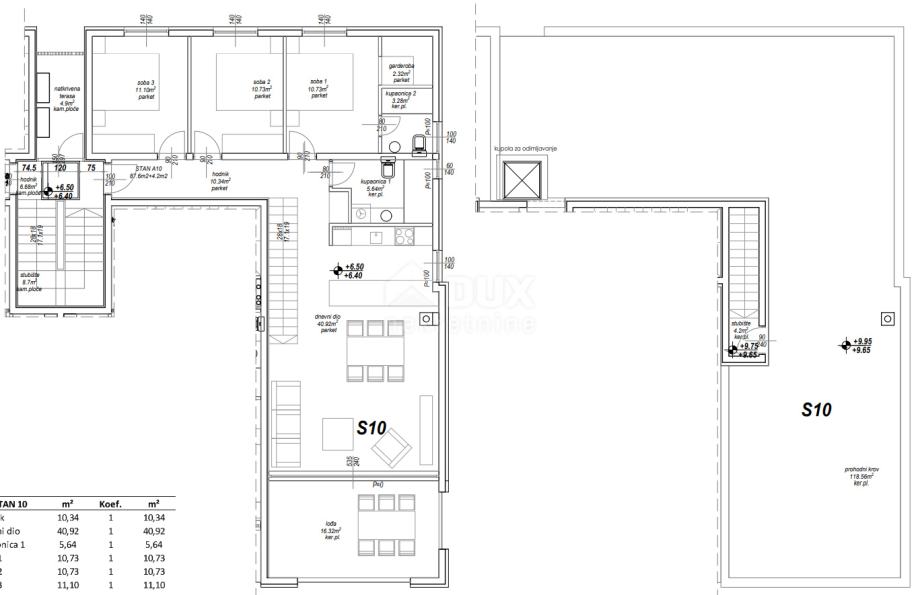 Istinska zvijezda ovog penthousea je veličanstvena krovna terasa površine 118,56 m2, mjesto gdje vaši snovi o životu uz more postaju stvarnost. Ova prostrana terasa omogućuje vam uživanje u zadivljujućem pogledu na Jadransko more, gdje možete doživjeti spektakularne zalaske sunca ili jednostavno uživati u miru i tišini dalmatinske obale. Terasa je idealna za organizaciju nezaboravnih druženja pod zvjezdanim nebom ili jednostavno uživanje u opuštajućim trenucima na svježem zraku.