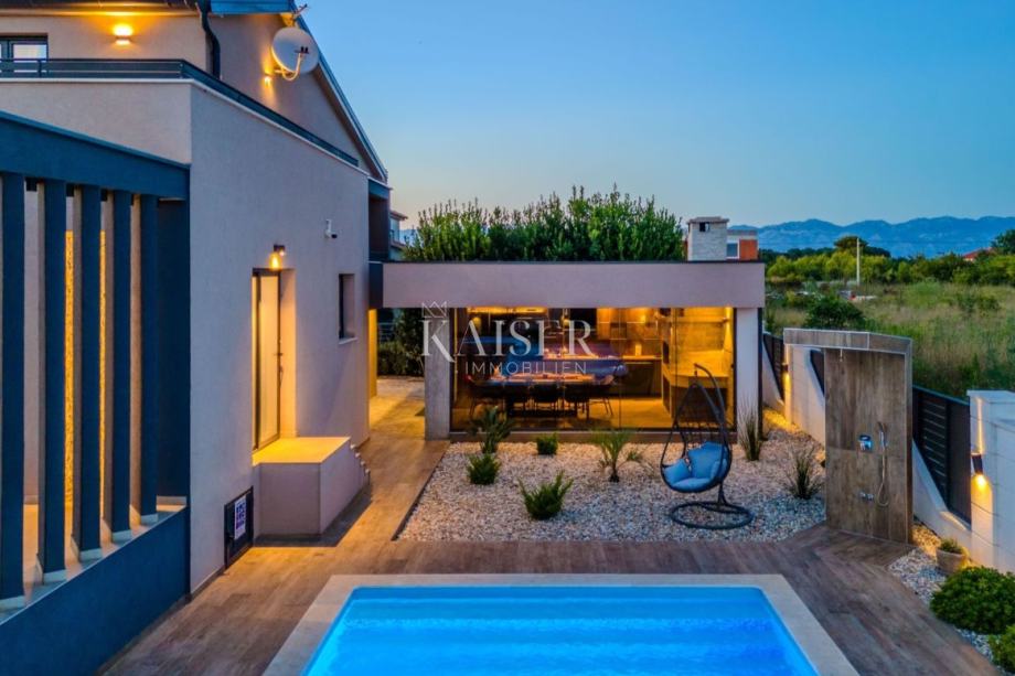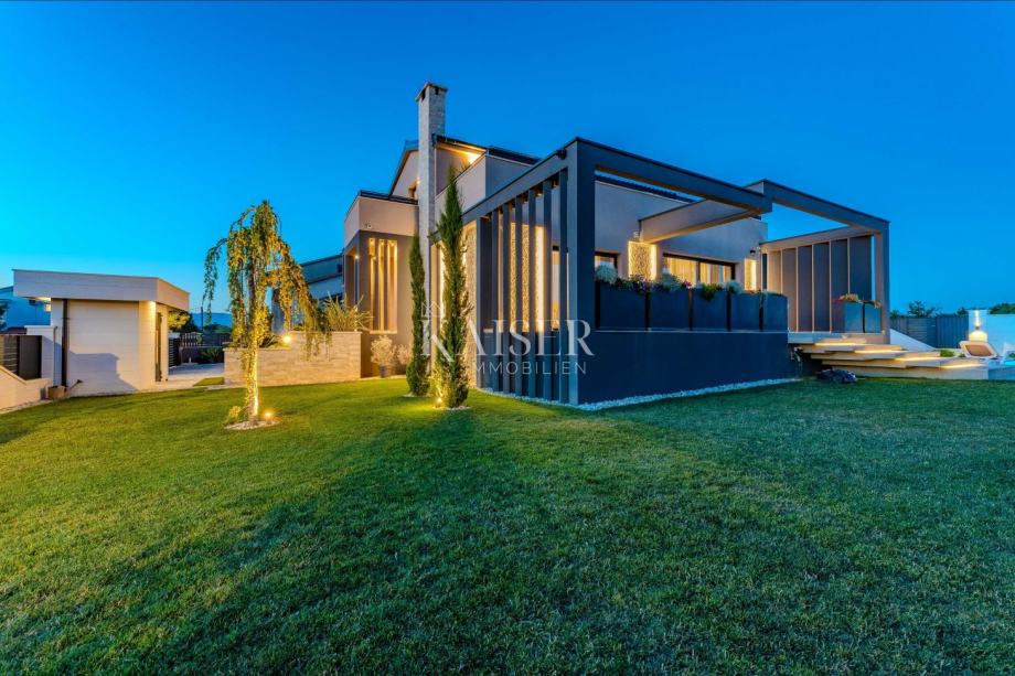 Smještena na parceli od 913 m2, okružena ničim osim prirodom, ova moderna vila od 350 m2 stapa se s okolinom bez nametanja. Samoodrživa je i energetski potpuno neovisna, zahvaljujući vlastitom solarnom sustavu. Ulaz na posjed organiziran je putem automatskog sustava vrata na daljinsko otvaranje i zatvaranje, koji vodi do predulaza s vlastitim trijemom. Do glavnog ulaza pristupa se stubištem, a sigurnost i kontrola pristupa osigurani su putem parlafona i videonadzora. Već pri samom ulasku u objekt pruža se otvoren pogled na uređenu okućnicu, bogatu mediteranskim biljem i prostranim travnjakom, što stvara osjećaj privatnosti i ugode. U središtu okućnice smješten je grijani bazen s integriranom whirpoolovom masažnom zonom, vanjskim tušem i sunčalištem — idealan prostor za uživanje u toplim danima. Poseban dodatak ovom vanjskom prostoru je pool house koji sadrži potpuno opremljenu ljetnu kuhinju, stvarajući savršeno okruženje za druženje i život na otvorenom tijekom većeg dijela godine.