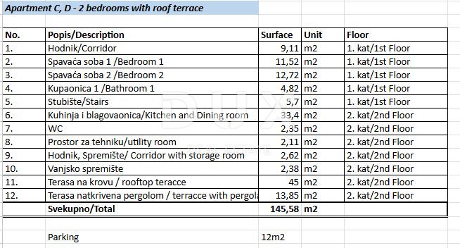 Stan koji se prodaje je dvoetažni, promišljeno raspoređen kako bi ponudio idealan spoj funkcionalnosti i komfora. Na prvoj etaži nalaze se dvije udobne spavaće sobe, moderna kupaonica i balkon. Na gornjoj etaži nalazi se prostrani dnevni boravak, kuhinja s blagovaonicom, dodatni WC te izlaz na veliku krovnu terasu s koje se pruža predivan pogled na more – savršeno mjesto za opuštanje i uživanje u zalascima sunca.