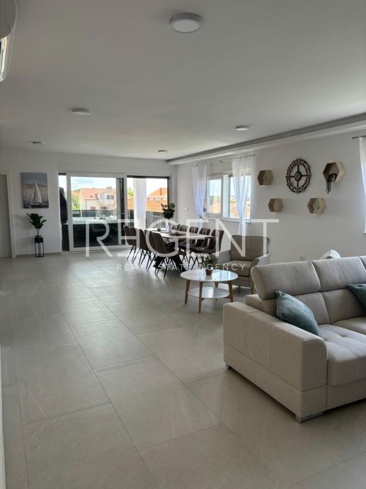 Na prodaju je ekskluzivan penthouse smješten u modernoj novogradnji u mirnom priobalnom mjestu Privlaka, udaljenom samo 20 minuta vožnje od Zadra. Stan je ukupne stambene površine 220 m2. Sastoji se od dvije etaže: open space dnevnog boravka s kuhinjom i blagovaonicom, tri spavaće sobe, tri kupaonice, terase. Ovo šarmantno mediteransko naselje poznato je po pješčanim plažama, kristalno čistom moru i opuštajućem načinu života, što ga čini savršenim za život, odmor ili investiciju.Penthouse se ističe suvremenim dizajnom, prostranim i svijetlim interijerima te vrhunskom kvalitetom gradnje. Velike staklene površine omogućuju obilje prirodnog svjetla i prekrasan pogled, dok su u izgradnji korišteni visokokvalitetni materijali poput podnog grijanja, klimatizacije, aluminijske stolarije te premium podnih obloga i sanitarija.Posebna prednost ove nekretnine je prostrana krovna terasa koja nudi spektakularan panoramski pogled na more i okolicu. Savršena je za opuštanje, druženja ili uživanje u nezaboravnim zalascima sunca.Nekretnina se nalazi u mirnoj rezidencijalnoj zoni, na samo nekoliko minuta hoda od plaže, dok su svi potrebni sadržaji poput trgovina, restorana i kafića u neposrednoj blizini.Ovaj luksuzni penthouse nudi vrhunski spoj elegancije, udobnosti i ekskluzivne lokacije uz more. Kontaktirajte nas za više informacija i dogovor oko razgledavanja!Za više informacija, kontaktirajte našeg agenta na brojeve telefona: