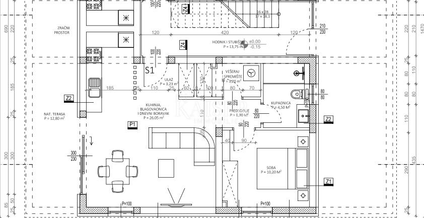 U prizemlju stambene zgrade smješten je stan S1 površine 67,18 m², smišljen za one koji traže sklad između privatnosti, udobnosti i ugodnog boravka na otvorenom. Već pri ulasku osjeća se dobar raspored prostora: ulazni dio površine 3,23 m² vodi u prozračan dnevni prostor od 26,05 m² u kojem su povezani kuhinja, blagovaonica i dnevni boravak – idealno mjesto za svakodnevni život i druženja. Predsoblje od 1,90 m² diskretno odvaja privatni dio stana, dok vešeraj i spremište površine 3,20 m² pružaju dodatnu praktičnost. Spavaća soba od 10,20 m² zamišljena je kao miran kutak za odmor, a kupaonica površine 4,50 m² funkcionalno je uklopljena u cjelinu stana.