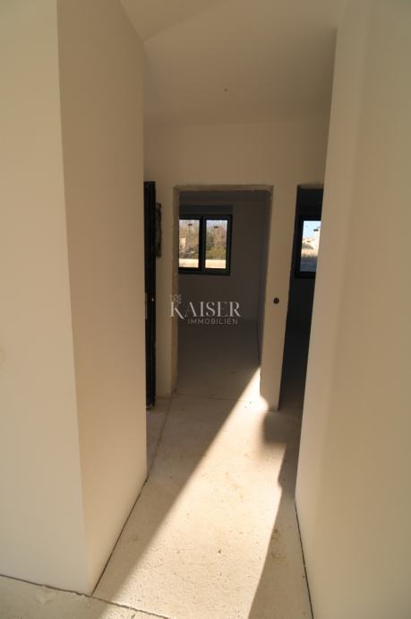 Unutrašnjost stana odiše osjećajem prostranosti i obiljem prirodne svjetlosti. Ulazni hodnik vodi u otvoreni dnevni prostor s kuhinjom i blagovaonicom, savršeno osmišljen za ugodna obiteljska druženja i opušteni boravak s pogledom prema vanjskom prostoru.