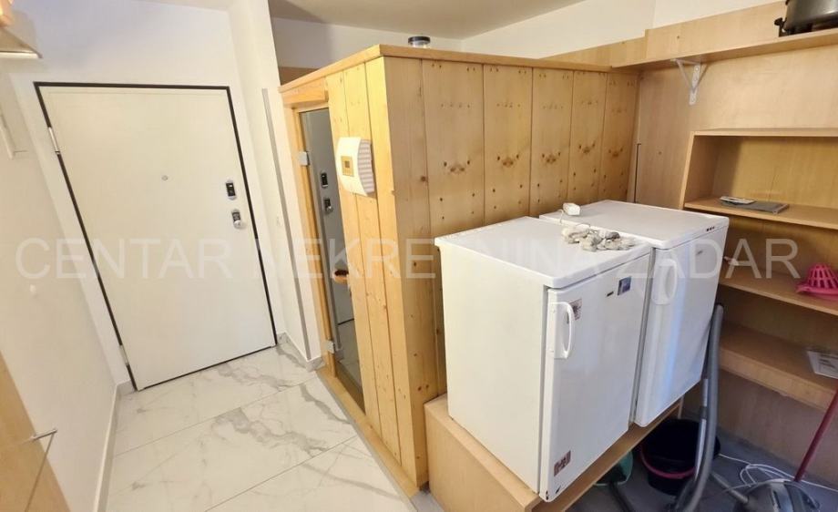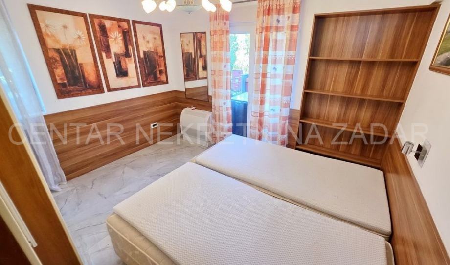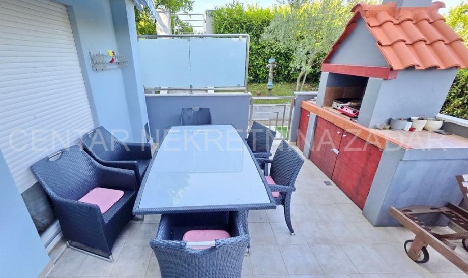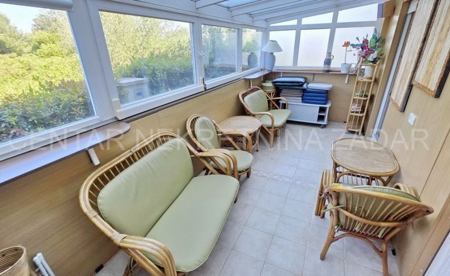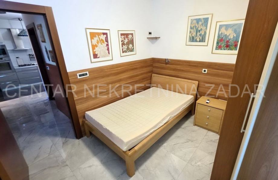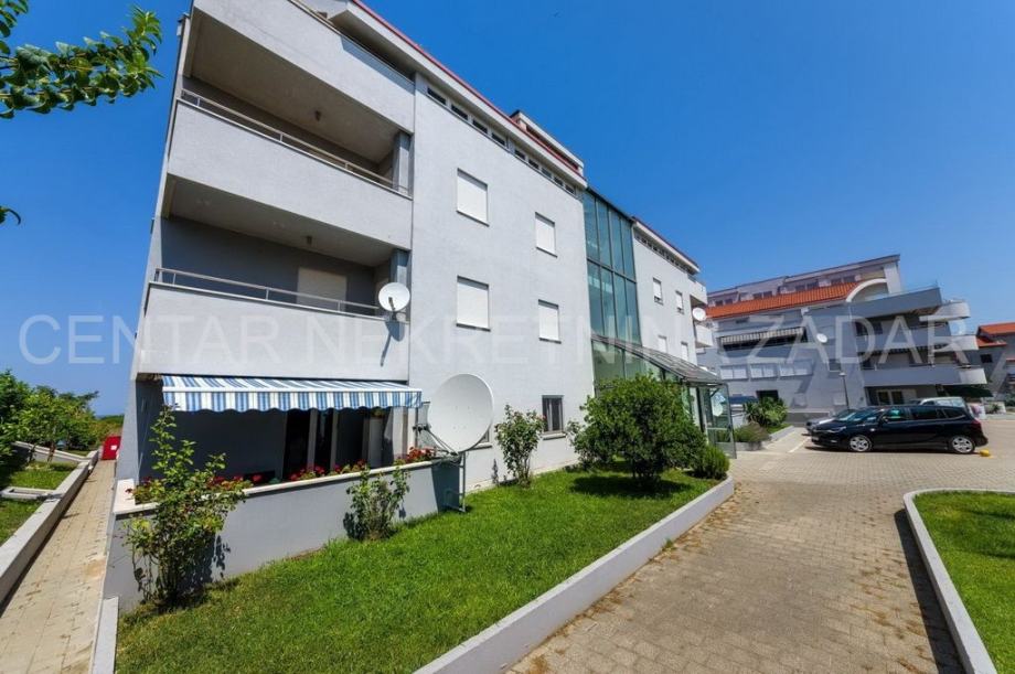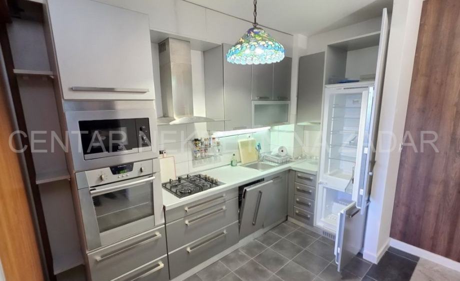 Na jedinstvenoj lokaciji, prodaje se prostran i komforan stan s tri spavaće sobe i velikom terasom, u novijoj zgradi s podzemnom garažom, elektronskim rampama, panoramskim dizalom, videonadzorom, videoparlafonom, ventilacijom, plinodetekcijom, dio energetike na solarno itd.Stan ima 124 m2 korisne neto stambene površine, te dodatno još sa podzemnom komfornom garažom sa sekcijskim vratima površine 23 m2 u podzemnom kompleksu.Stambeni prostor se sastoji od ulaznog hodnika, prostora saune i vešeraja, jednog komfornog kupatila, tri spavaće sobe, dnevnog boravka, velike blagovaonice, kuhinje i još jednog kupatila, te velike dijelom natrkivene terase od 30 m2, te još terase zatvorene 'zimskim vrtom' (pvc stolarijom) površine od 20 m2.Terasa u prizemlju ima tende na elektromotore kao i mali komin.Kompletno sauna za 4 osobe je nedavno instalirana te je kao nova.Stan ima ulazna elektronska-blindo vrata, Dierre Bi-Elletra sa displayom - chip/ključ sustav. Unutrašnji podovi su pretežno u drvenim parketima (Florian SpA). Unutrašnja sobna vrata su Barausse. PVC fasadni otvori Finstral, profili koji imaju rolete i komarnike.IZUZETNO DOBRO OPREMLJEN STAN NA VRLO POSEBNOJ LOKACIJI U OVOM DIJELU ZADRA!VIŠE INFORMACIJA NA UPIT!Ekskluzivan ugovor o posredovanju.