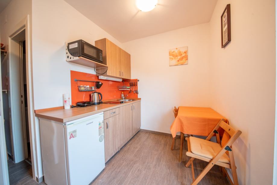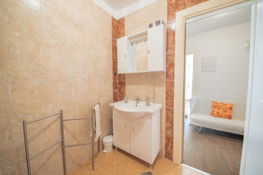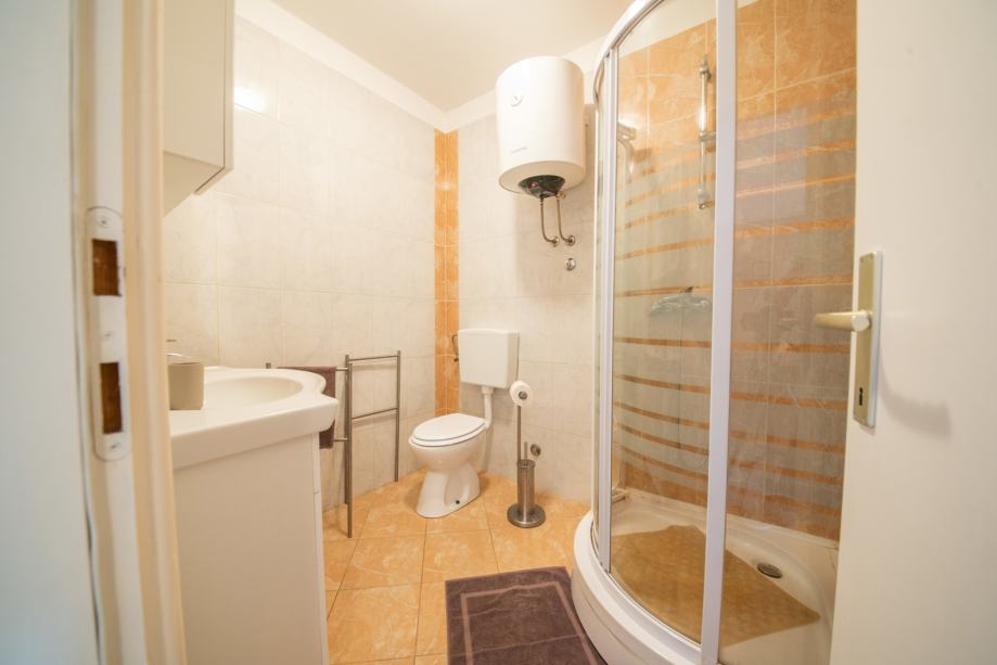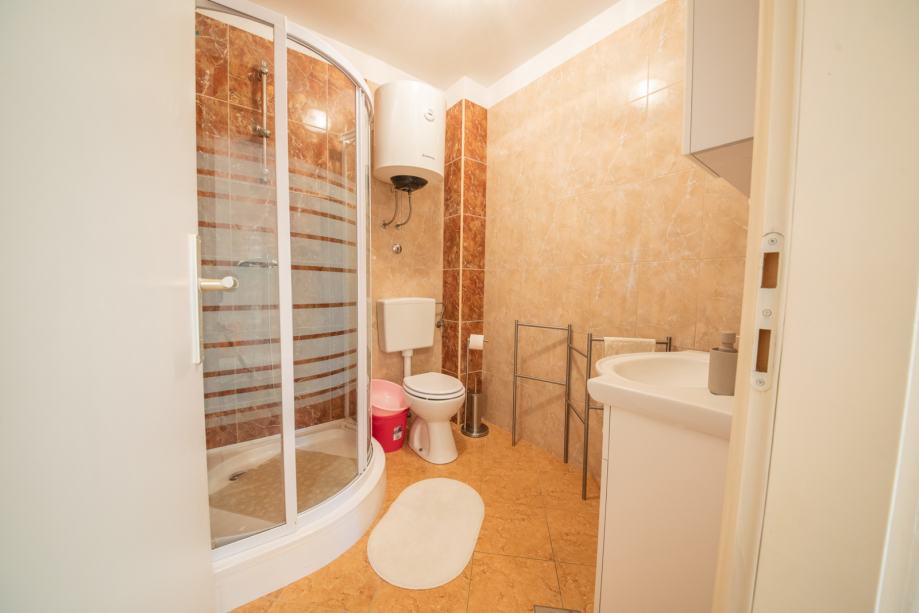 U prizemlju se nalazi apartman s kuhinjom, blagavaonicom i dnevnim boravkom, dvije spavaće sobe (jedna soba je ogromna, a druga je normalne veličine), kupaonice i terase.