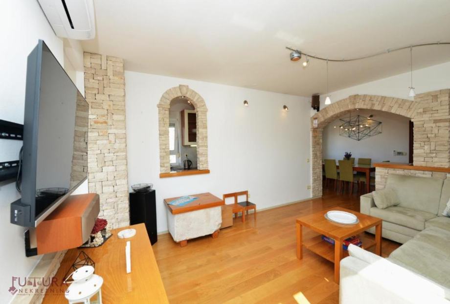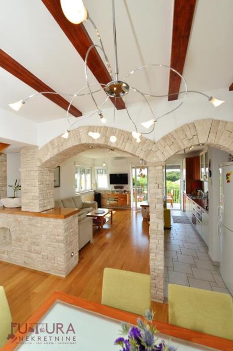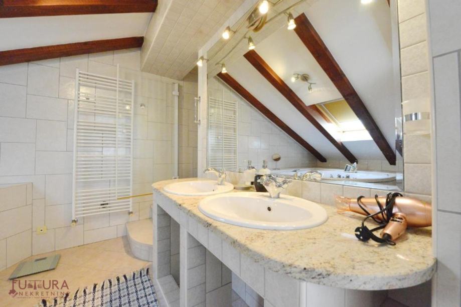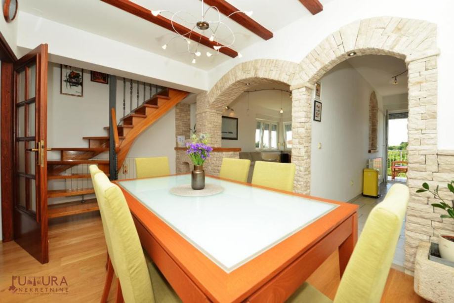 - donja: dvije spavaće sobe, dnevni boravak + kuhinja + blagovaona, predsoblje, kupaonice i balkona.