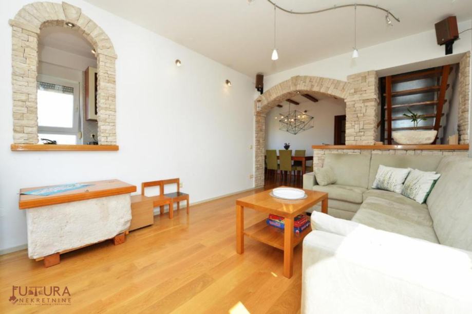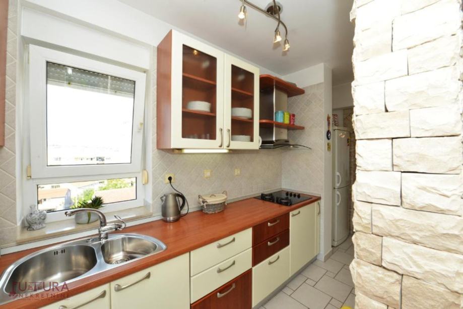 Zadar - Relja, prodaje se trosobni dvoetažni stan od 77,93 m2 (u naravi 102 m2) na četvrtom katu stambene zgrade izgrađene 2002 godine, kompletno namješten.