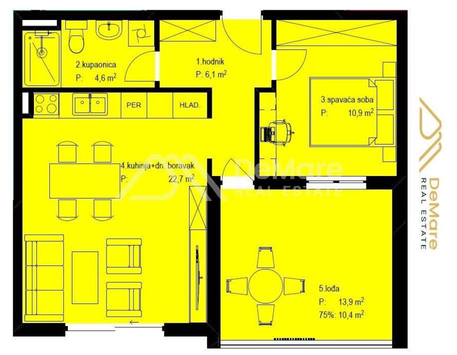 - Dnevnog boravka, kuhinje i blagovaonice / 22,69 m2