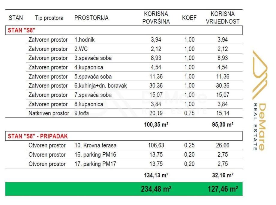 Ukupna korisna obračunska vrijednost površine stana sa svim pripadcima iznosi 127,46 m2.