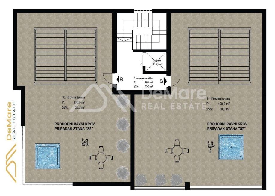 Krov zgrade iznad drugog kata je podijeljen na dvije krovne terase, te svakom stanu koji se nalazi na drugom katu, pripada jedna odvojena krovna terasa.