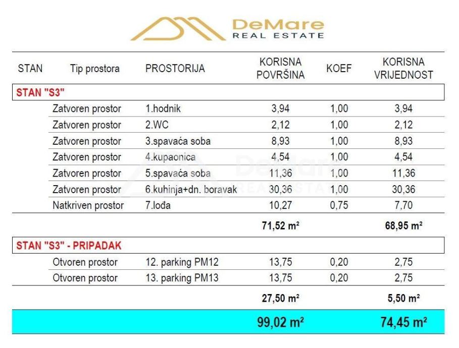 Ukupna korisna obračunska vrijednost površine stana sa svim pripadcima iznosi 74,45 m2.