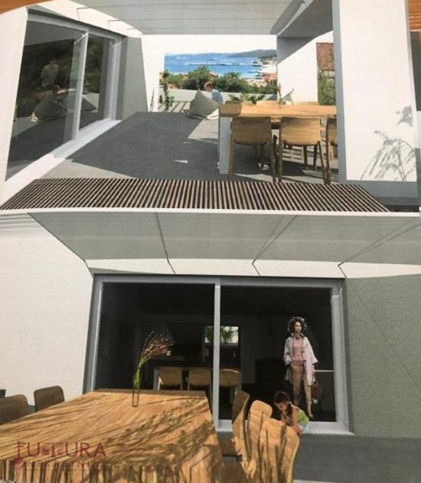 Sastoji se od: tri spavaće sobe, dnevnog boravka + kuhinja + blagovaona, kupaonice, wc-a i velike terase.