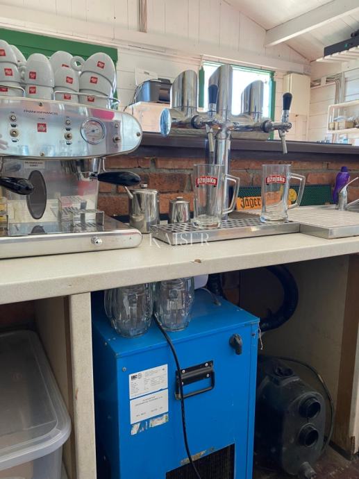 Objekt je smješten u kućici koja sadrži sve potrebno za uspješno vođenje ugostiteljskog posla. U sklopu kućice nalaze se šank, perilica suđa, ledomat, kuhinjska oprema (termoblok, friteza, roštilj, kuhala), dupli hladnjak te kompletan inventar za posluživanje i kuhanje. Uz to, objekt je opremljen razglasom, pojačalom za terasu te videonadzorom.