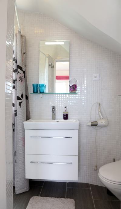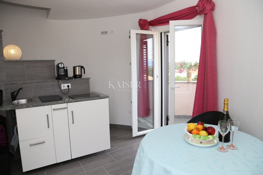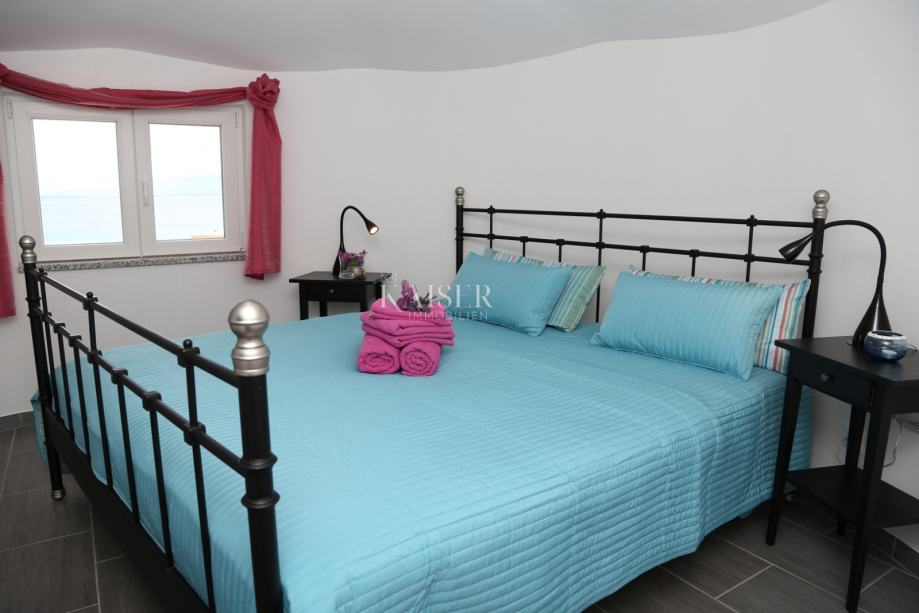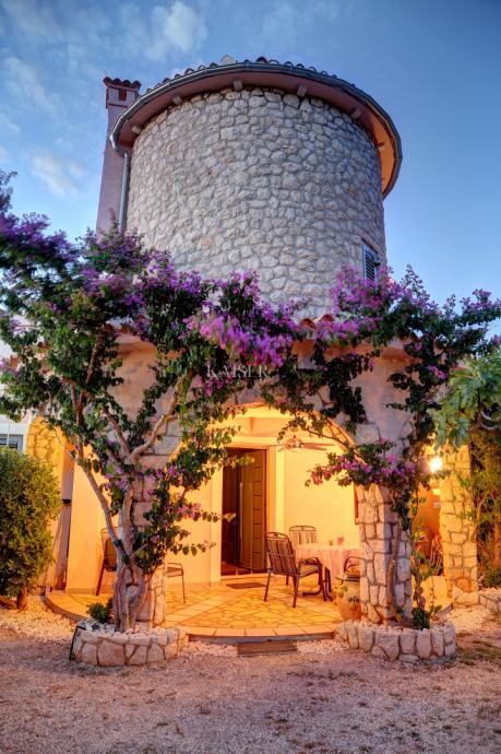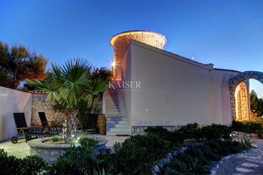 Prvi kat se sastoji od Apartmana u kuli od 30 m2 (čisti stambeni prostor) s kuhinjom/dnevnim boravkom, kupaonicom, balkonom s pogledom na more, spavaćom sobom (treći kat), zasebnim ulazom, terasom od 40 m2 s pogledom na more uklj. vanjska kuhinja i vrtni tuš