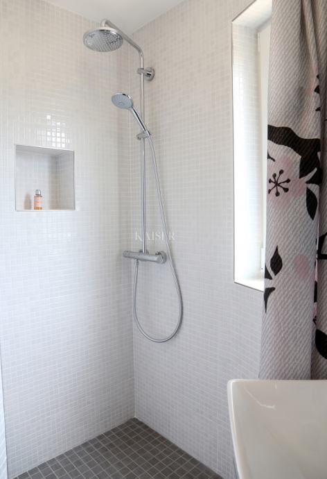 Prizemlje se sastoji od stana stan a od 70 m2 (čisti stambeni prostor) s kuhinjom/dnevnim boravkom, kupaonicom, dvije spavaće sobe, 30 m2 natkrivene terase, 120 m2 terase, 35 m2 terase s pogledom na more.
