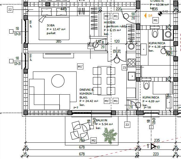U ponudi je jednosoban stan oznake S4, na 1. katu zgrade, južne orijentacije. Sastoji se od hodnika, kuhinje s blagovaonicom i dnevnim boravkom, balkona, kupaonice te jedne spavaće sobe. Netto stambena površina stana iznosi 49,90 m2. Pripadaju mu dva vanjska parkirna mjesta, od kojih je jedno natkriveno te spremište. Ukupna obračunska površina stana i pripadaka iznosi 61,71 m2.