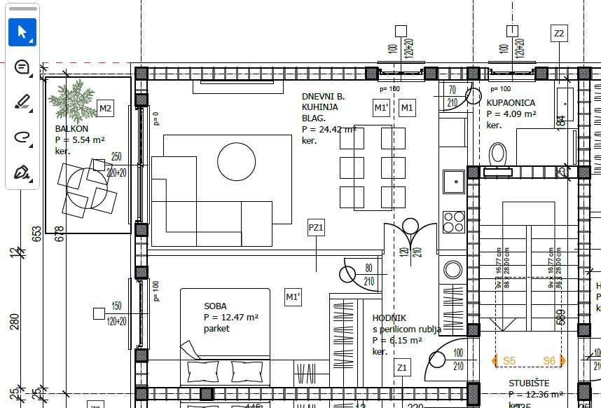 U ponudi je jednosoban stan oznake S5, na 2. katu zgrade, zapadne orijentacije. Sastoji se od hodnika, kuhinje s blagovaonicom i dnevnim boravkom, balkona, kupaonice te jedne spavaće sobe. Netto stambena površina stana iznosi 49,90 m2. Pripadaju mu dva vanjska parkirna mjesta, od kojih je jedno natkriveno te spremište. Ukupna obračunska površina stana i pripadaka iznosi 61,39 m2.