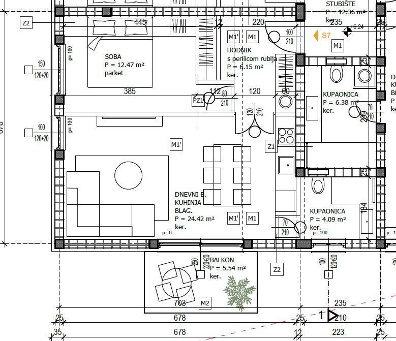 U ponudi je jednosoban stan oznake S7, na 2. katu zgrade, južne orijentacije. Sastoji se od hodnika, kuhinje s blagovaonicom i dnevnim boravkom, balkona, kupaonice te jedne spavaće sobe. Netto stambena površina stana iznosi 49,90 m2. Pripadaju mu dva vanjska parkirna mjesta, od kojih je jedno natkriveno te spremište. Ukupna obračunska površina stana i pripadaka iznosi 61,10 m2.