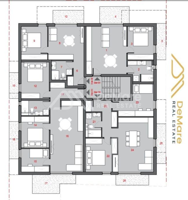 Zgrada se sastoji od prizemlja i 3 kata sa ukupno 8 stambenih jedinica. U prizemlju se nalazi natkriveno parkiralište, a svakom stanu pripadaju 2 parkirna mjesta.