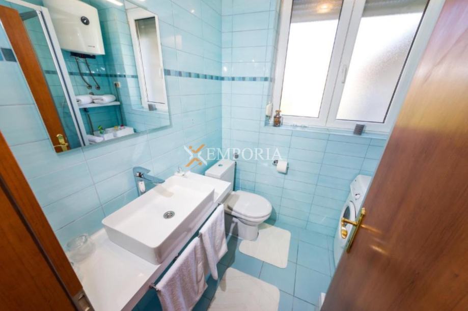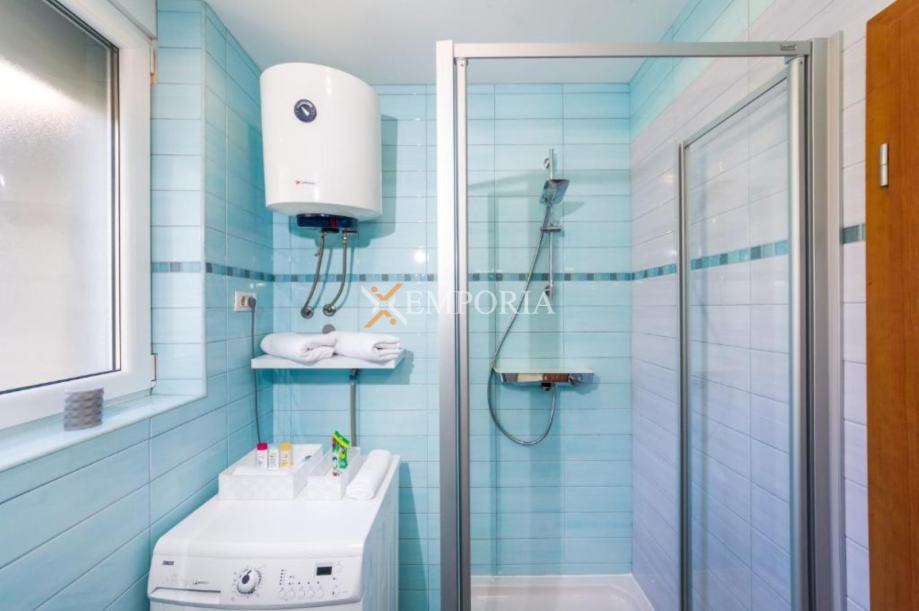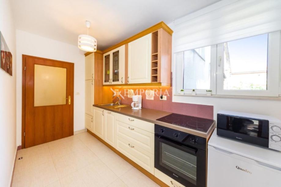 Stan se prodaje namješten, što omogućuje brže useljenje ili početak iznajmljivanja. Dodatnu funkcionalnost pruža odvojeni dnevni boravak, kao i praktična ostava.OpremaZgrada je građena s punim betonskim pločama između etaža, što osigurava kvalitetnu konstrukciju. Ugrađena je PVC stolarija s roletama i komarnicima. Podne obloge čine pločice i laminat. Stan je opremljen klimatskim uređajem u blagovaonici te posjeduje dimnjak, što omogućuje dodatne opcije grijanja.