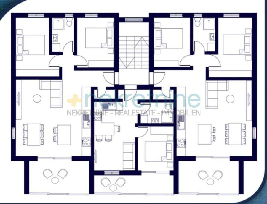 Zgrada na tri etaže, prizemlje i dva kata. Na svakoj etaži nalaze se po tri stana.