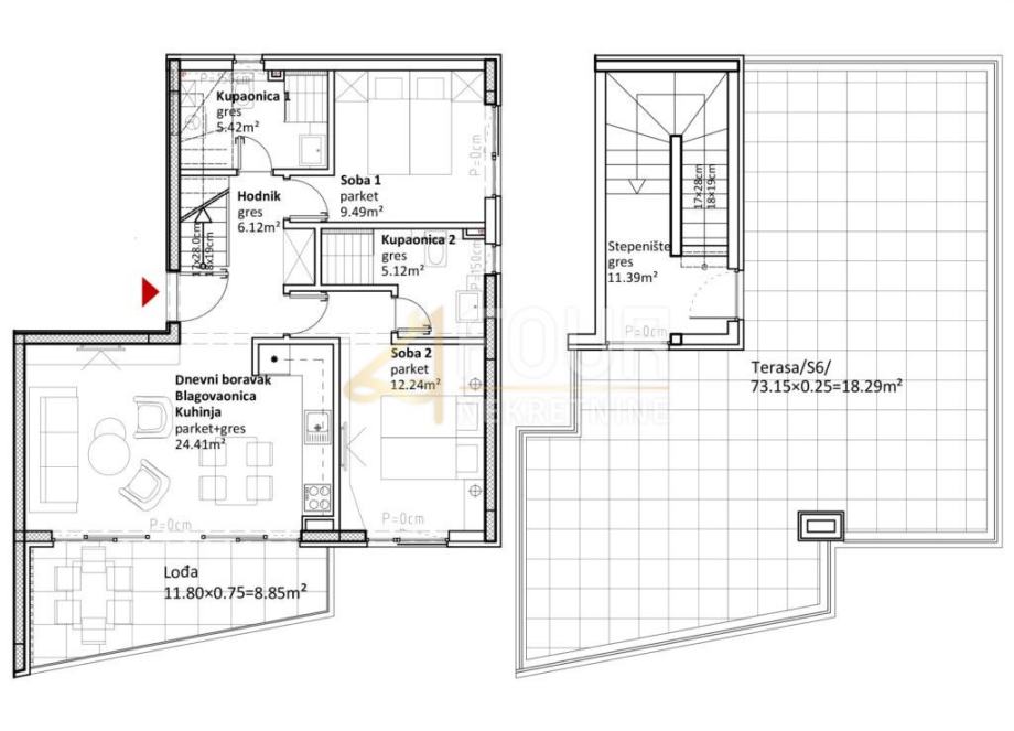 Dodatni luksuz stanu daju krovna terasa i lođa, idealni za uživanje u mediteranskom ambijentu. Stan je potpuno klimatiziran, izgrađen s vrhunskim materijalima kao što su 10 cm termoizolacije, PVC stolarija s troslojnim staklima, električne rolete i komarnici, osiguravajući maksimalnu energetsku učinkovitost i udobnost.