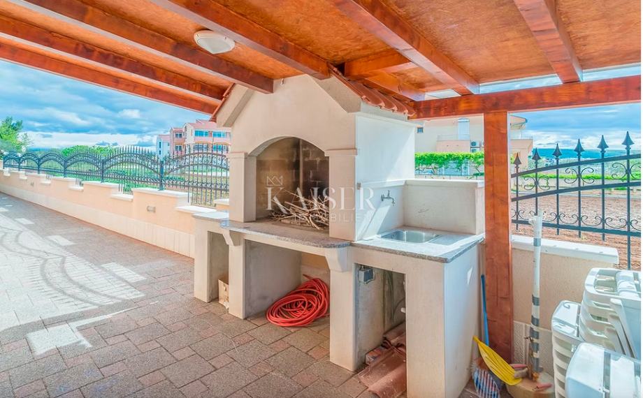 Okućnica površine 187 m2 nudi prostrano dvorište, koje se može oblikovati prema željama novog vlasnika. Ovdje se već nalazi veliki parking s natkrivenim mjestima, a postoji i mogućnost izgradnje bazena, koji bi dodatno podigao atraktivnost ove nekretnine. Prostor je savršen za organiziranje opuštajućih večeri uz roštilj ili sunčanje u privatnosti vlastitog dvorišta.