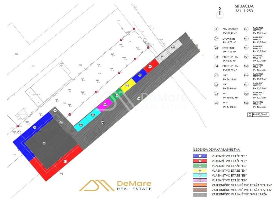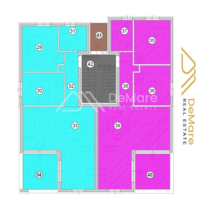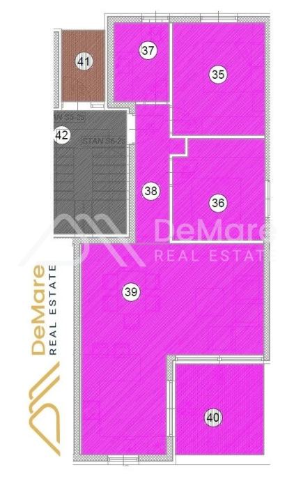 Objekt se sastoji od 3 etaže (PR+2) s krovnom terasom, sa ukupno 6 dvosobnih stanova- dva stana na svakoj etaži.