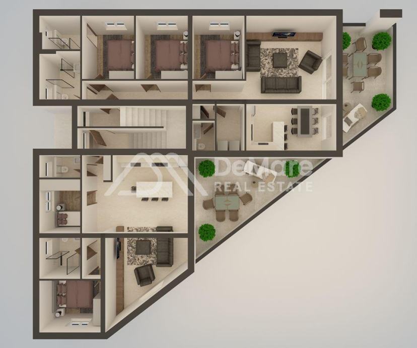 U prizemlju i na prvom katu smještena su 4 apartmana sa natkrivenim terasama, a na drugom katu nalaze se dva penthouse apartmana s krovnim terasama sa kojih se pruža prekrasan panoramski pogled na more i zadarski arhipelag.