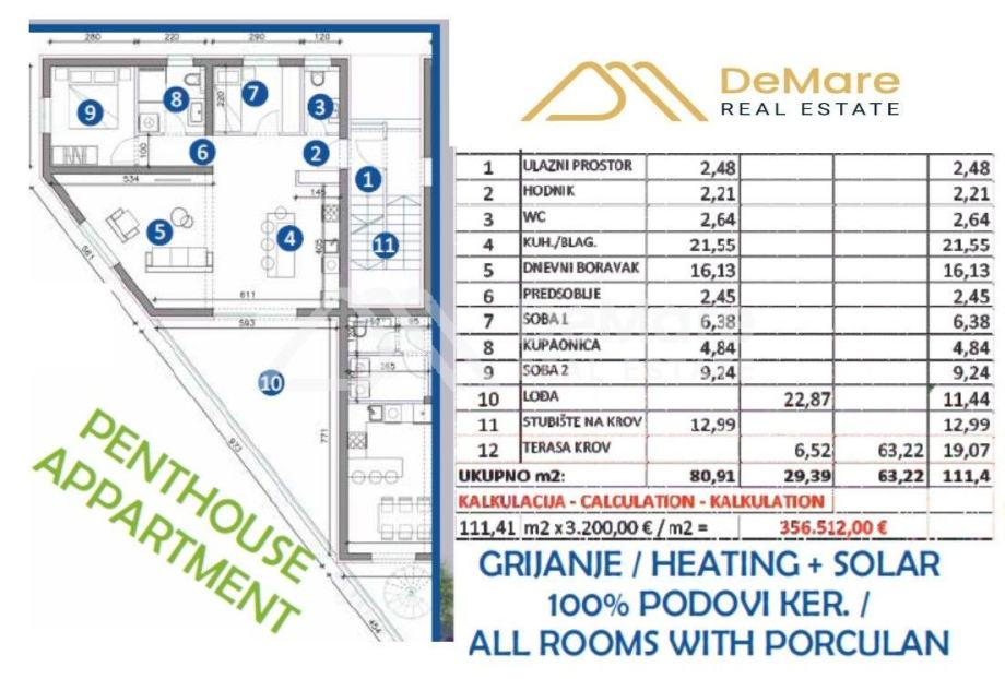 Ukupna površina stana je 173,52 m2 a obračunska vrijednost korisne površine stana iznosi 111,40 m2.