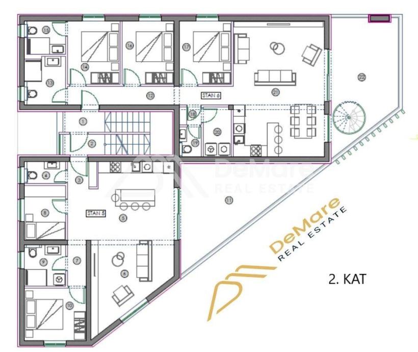 Objekt se sastoji od 4 etaže (SUTEREN+PR+2) s krovnim terasama koje pripadaju penthouse stanovima na 2. katu.